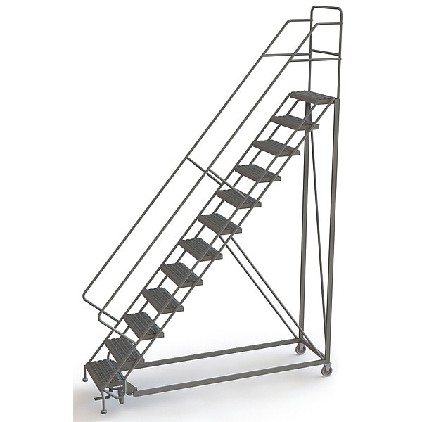 Configurable Rolling Ladder, Material Steel, Platform Height 10 ft, Handrails Included Yes, Handrail Height 3 ft, Overall Height 13.5 ft, Number of Steps 12, Unassembled, Load Capacity 450 lb, Step Tread Serrated, Platform Depth 17 in, Platform Width 24 in, Bottom Width 35 in, Base Depth 116 in, Overall Width 35 in, Climbing Angle 50 Degrees , Step Depth 8.5 in, Step Width 24 in, Ladder Actuation Foot Activated Step Lock, Finish Powder Coated, Color Gray, Standards ANSI, OSHA Compliant