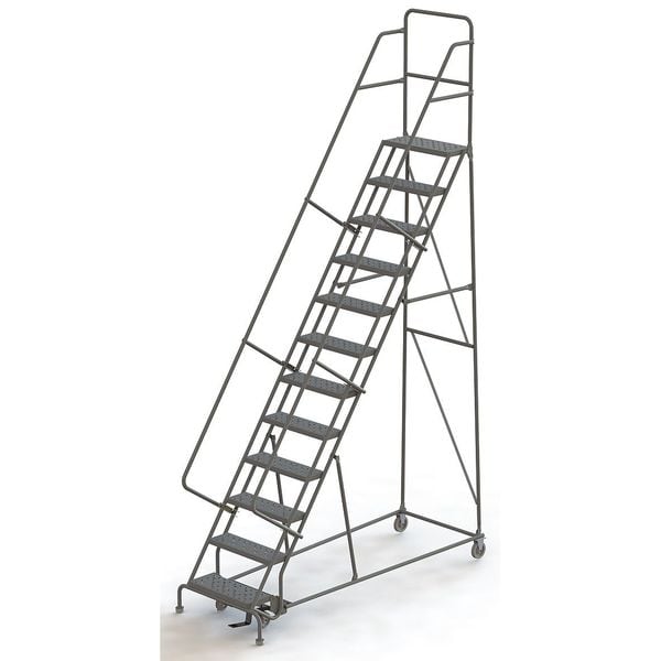 Rolling Ladder, Material Steel, Platform Height 10 ft, Handrails Included Yes, Handrail Height 3 ft, Overall Height 13.5 ft, Number of Steps 12, Unassembled, Load Capacity 450 lb, Step Tread Serrated, Platform Depth 10 in, Platform Width 24 in, Bottom Width 35 in, Base Depth 90 in, Overall Width 35 in, Climbing Angle 56 Degrees , Step Depth 7 in, Step Width 24 in, Ladder Actuation Foot Activated Step Lock, Finish Powder Coated, Color Gray, Standards ANSI, OSHA Compliant