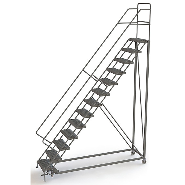Configurable Rolling Ladder, Material Steel, Platform Height 10.8 ft, Handrails Included Yes, Handrail Height 3 ft, Overall Height 14.3 ft, Number of Steps 13, Unassembled, Load Capacity 450 lb, Step Tread Serrated, Platform Depth 17 in, Platform Width 24 in, Bottom Width 40 in, Base Depth 124 in, Overall Width 40 in, Climbing Angle 50 Degrees , Step Depth 8.5 in, Step Width 24 in, Ladder Actuation Foot Activated Step Lock, Finish Powder Coated, Color Gray, Standards ANSI, OSHA Compliant