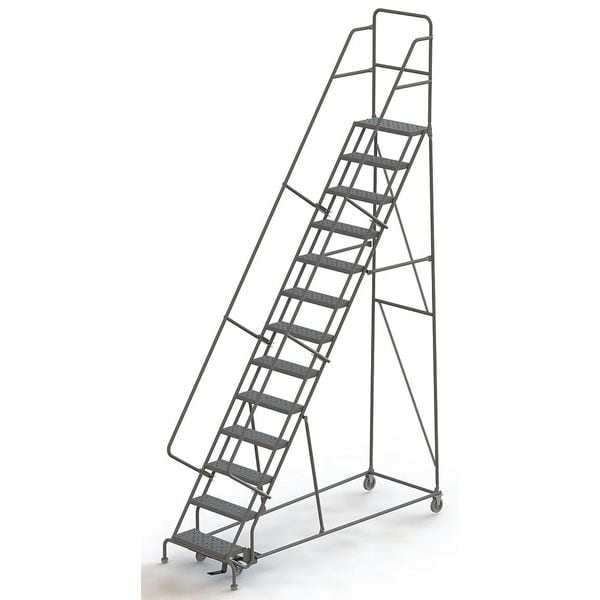 Rolling Ladder, Material Steel, Platform Height 10.8 ft, Handrails Included Yes, Handrail Height 3 ft, Overall Height 14.3 ft, Number of Steps 13, Unassembled, Load Capacity 450 lb, Step Tread Serrated, Platform Depth 10 in, Platform Width 24 in, Bottom Width 40 in, Base Depth 96 in, Overall Width 39 in, Climbing Angle 56 Degrees , Step Depth 7 in, Step Width 24 in, Ladder Actuation Foot Activated Step Lock, Finish Powder Coated, Color Gray, Standards ANSI, OSHA Compliant