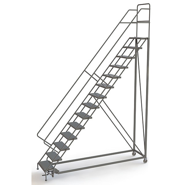 Configurable Rolling Ladder, Material Steel, Platform Height 11.7 ft, Handrails Included Yes, Handrail Height 3 ft, Overall Height 15.2 ft, Number of Steps 14, Unassembled, Load Capacity 450 lb, Step Tread Perforated, Platform Depth 17 in, Platform Width 24 in, Bottom Width 40 in, Base Depth 132 in, Overall Width 40 in, Climbing Angle 50 Degrees , Step Depth 8.5 in, Step Width 24 in, Ladder Actuation Foot Activated Step Lock, Finish Powder Coated, Color Gray, Standards ANSI, OSHA Compliant
