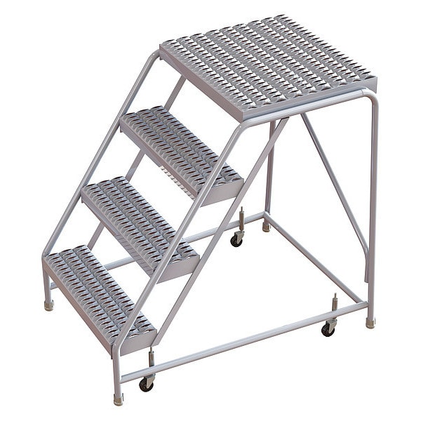 Rolling Ladder, Material Aluminum, Platform Height 3.3 ft, Handrails Included No, Handrail Height Not Applicable, Overall Height 3.3 ft, Number of Steps 4, Assembled, Load Capacity 350 lb, Step Tread Serrated, Platform Depth 21 in, Platform Width 16 in, Bottom Width 21 in, Base Depth 43 in, Overall Width 22 in, Climbing Angle 56 Degrees , Step Depth 7 in, Step Width 16 in, Ladder Actuation Spring-Loaded Casters, Finish Powder Coated, Color Gray, Standards ANSI, OSHA Compliant