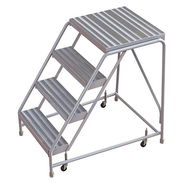 Rolling Ladder, Material Aluminum, Platform Height 3.3 ft, Handrails Included No, Handrail Height Not Applicable, Overall Height 3.3 ft, Number of Steps 4, Assembled, Load Capacity 350 lb, Step Tread Ribbed, Platform Depth 21 in, Platform Width 24 in, Bottom Width 29 in, Base Depth 33 in, Overall Width 32 in, Climbing Angle 56 Degrees , Step Depth 7 in, Step Width 24 in, Ladder Actuation Spring-Loaded Casters, Finish Powder Coated, Color Gray, Standards ANSI, OSHA Compliant, Includes Crutch Tips