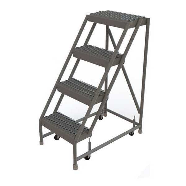 Rolling Ladder, Material Steel, Platform Height 3.3 ft, Handrails Included No, Handrail Height Not Applicable, Overall Height 3.3 ft, Number of Steps 4, Unassembled, Load Capacity 450 lb, Step Tread Serrated, Platform Depth 10 in, Platform Width 16 in, Bottom Width 24 in, Base Depth 35 in, Overall Width 24 in, Climbing Angle 56 Degrees , Step Depth 7 in, Step Width 16 in, Ladder Actuation Spring-Loaded Casters, Finish Powder Coated, Color Gray, Standards ANSI, OSHA Compliant