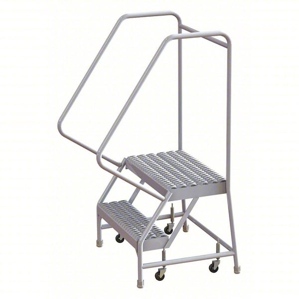 Rolling Ladder, Material Aluminum, Platform Height 1.7 ft, Handrails Included Yes, Handrail Height 2.7 ft, Overall Height 4.3 ft, Number of Steps 2, Assembled, Load Capacity 350 lb, Step Tread Serrated, Platform Depth 14 in, Platform Width 24 in, Bottom Width 29 in, Base Depth 23 in, Overall Width 29 in, Climbing Angle 56 Degrees , Step Depth 7 in, Step Width 24 in, Ladder Actuation Spring-Loaded Casters, Finish Unfinished, Color Silver, Standards ANSI, OSHA Compliant, Includes Crutch Tips