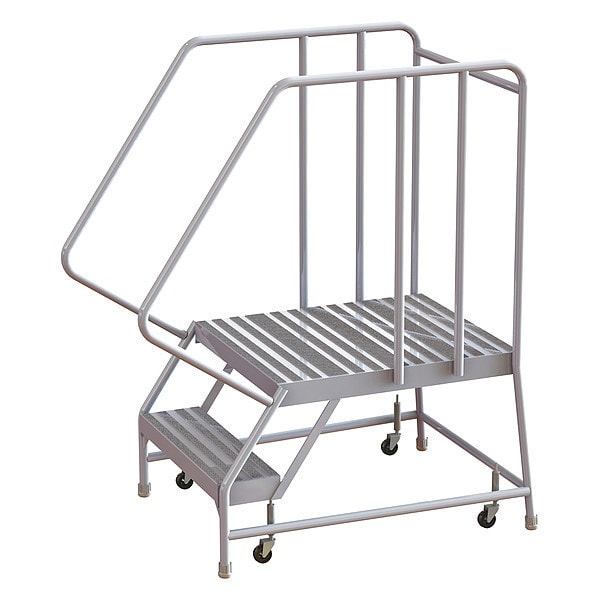 Rolling Ladder, Material Aluminum, Platform Height 1.7 ft, Handrails Included Yes, Handrail Height 2.7 ft, Overall Height 4.3 ft, Number of Steps 2, Assembled, Load Capacity 350 lb, Step Tread Ribbed, Platform Depth 28 in, Platform Width 24 in, Bottom Width 29 in, Base Depth 37 in, Overall Width 29 in, Climbing Angle 56 Degrees , Step Depth 7 in, Step Width 24 in, Ladder Actuation Spring-Loaded Casters, Finish Powder Coated, Color Gray, Standards ANSI, OSHA Compliant, Includes Crutch Tips
