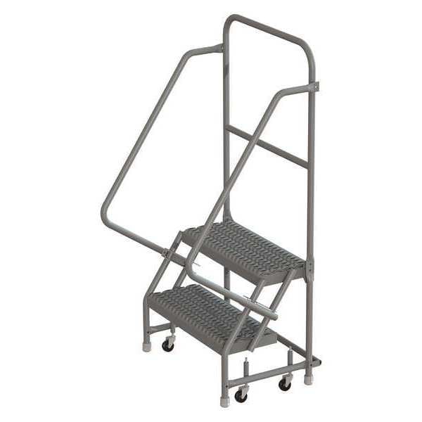 Rolling Ladder, Material Steel, Platform Height 1.7 ft, Handrails Included Yes, Handrail Height 3 ft, Overall Height 5.2 ft, Number of Steps 2, Unassembled, Load Capacity 450 lb, Step Tread Serrated, Platform Depth 10 in, Platform Width 16 in, Bottom Width 21 in, Base Depth 21 in, Overall Width 21 in, Climbing Angle 56 Degrees , Step Depth 7 in, Step Width 16 in, Ladder Actuation Spring-Loaded Casters, Finish Powder Coated, Color Gray, Standards ANSI, OSHA Compliant, Includes Crutch Tips
