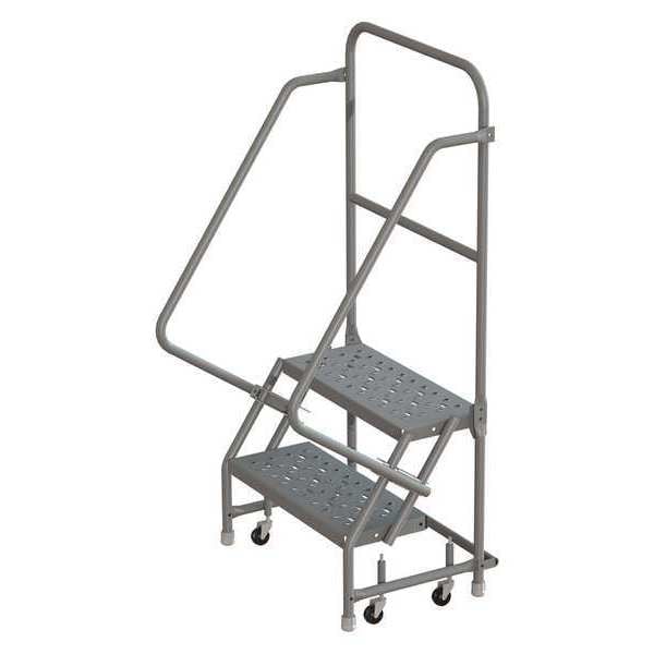 Rolling Ladder, Material Steel, Platform Height 1.7 ft, Handrails Included Yes, Handrail Height 3 ft, Overall Height 5.2 ft, Number of Steps 2, Unassembled, Load Capacity 450 lb, Step Tread Perforated, Platform Depth 10 in, Platform Width 16 in, Bottom Width 21 in, Base Depth 21 in, Overall Width 21 in, Climbing Angle 56 Degrees , Step Depth 7 in, Step Width 16 in, Ladder Actuation Spring-Loaded Casters, Finish Powder Coated, Color Gray, Standards ANSI, OSHA Compliant, Includes Crutch Tips