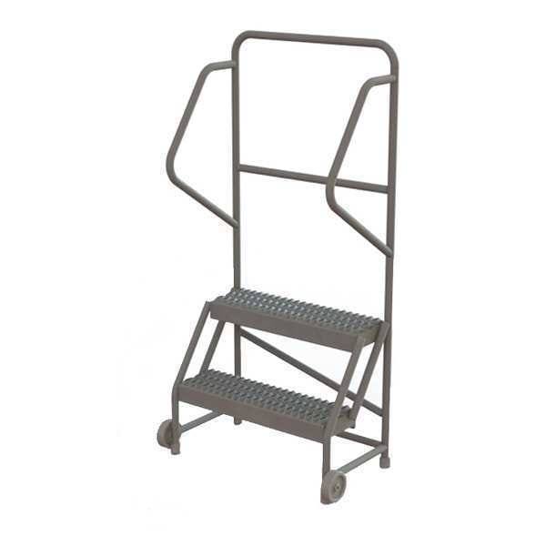 Tilt and Roll Ladder, Material Steel, Platform Height 1.7 ft, Handrails Included Yes, Handrail Height 3 ft, Overall Height 5.2 ft, Number of Steps 2, Unassembled, Load Capacity 450 lb, Step Tread Serrated, Platform Depth 10 in, Platform Width 24 in, Bottom Width 31 in, Base Depth 23 in, Overall Width 31 in, Climbing Angle 56 Degrees , Step Depth 7 in, Step Width 24 in, Ladder Actuation None, Finish Powder Coated, Color Gray, Standards ANSI, OSHA Compliant, Includes Crutch Tips