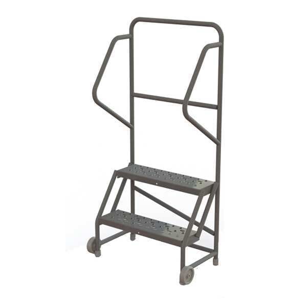 Tilt and Roll Ladder, Material Steel, Platform Height 1.7 ft, Handrails Included Yes, Handrail Height 3 ft, Overall Height 5.2 ft, Number of Steps 2, Unassembled, Load Capacity 450 lb, Step Tread Perforated, Platform Depth 10 in, Platform Width 24 in, Bottom Width 31 in, Base Depth 23 in, Overall Width 31 in, Climbing Angle 56 Degrees , Step Depth 7 in, Step Width 24 in, Ladder Actuation None, Finish Powder Coated, Color Gray, Standards ANSI, OSHA Compliant, Includes Crutch Tips