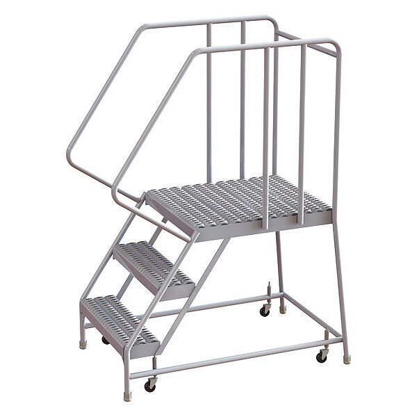 Rolling Ladder, Material Aluminum, Platform Height 2.5 ft, Handrails Included Yes, Handrail Height 2.7 ft, Overall Height 5.2 ft, Number of Steps 3, Assembled, Load Capacity 350 lb, Step Tread Serrated, Platform Depth 28 in, Platform Width 16 in, Bottom Width 22 in, Base Depth 45 in, Overall Width 22 in, Climbing Angle 56 Degrees , Step Depth 7 in, Step Width 16 in, Ladder Actuation Spring-Loaded Casters, Finish Powder Coated, Color Gray, Standards ANSI, OSHA Compliant, Includes Crutch Tips