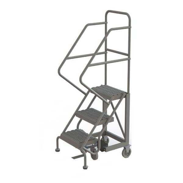 Rolling Ladder, Material Steel, Platform Height 2.5 ft, Handrails Included Yes, Handrail Height 3 ft, Overall Height 5.5 ft, Number of Steps 3, Unassembled, Load Capacity 450 lb, Step Tread Serrated, Platform Depth 17 in, Platform Width 16 in, Bottom Width 27 in, Base Depth 41 in, Overall Width 27 in, Climbing Angle 50 Degrees , Step Depth 8.5 in, Step Width 16 in, Ladder Actuation Foot Activated Step Lock, Finish Powder Coated, Color Gray, Standards ANSI, OSHA Compliant