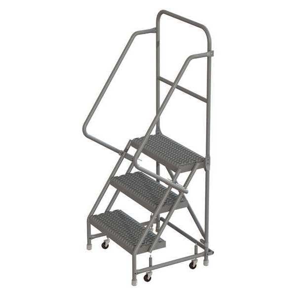 Rolling Ladder, Material Steel, Platform Height 2.5 ft, Handrails Included Yes, Handrail Height 3 ft, Overall Height 5.5 ft, Number of Steps 3, Assembled, Load Capacity 450 lb, Step Tread Serrated, Platform Depth 10 in, Platform Width 24 in, Bottom Width 28 in, Base Depth 27 in, Overall Width 28 in, Climbing Angle 56 Degrees , Step Depth 7 in, Step Width 24 in, Ladder Actuation Spring-Loaded Casters, Finish Powder Coated, Color Gray, Standards ANSI, OSHA Compliant, Includes Crutch Tips