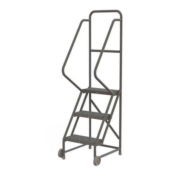 Tilt and Roll Ladder, Material Steel, Platform Height 2.5 ft, Handrails Included Yes, Handrail Height 3 ft, Overall Height 6 ft, Number of Steps 3, Unassembled, Load Capacity 450 lb, Step Tread Perforated, Platform Depth 10 in, Platform Width 16 in, Bottom Width 24 in, Base Depth 30 in, Overall Width 24 in, Climbing Angle 56 Degrees , Step Depth 7 in, Step Width 16 in, Ladder Actuation None, Finish Powder Coated, Color Gray, Standards ANSI, OSHA Compliant, Includes Crutch Tips