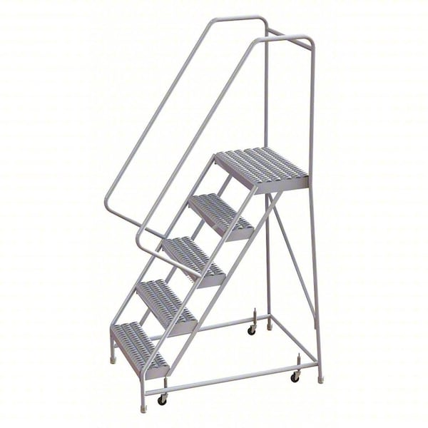 Rolling Ladder, Material Aluminum, Platform Height 4.2 ft, Handrails Included Yes, Handrail Height 2.7 ft, Overall Height 6.8 ft, Number of Steps 5, Assembled, Load Capacity 350 lb, Step Tread Serrated, Platform Depth 14 in, Platform Width 24 in, Bottom Width 32 in, Base Depth 44 in, Overall Width 32 in, Climbing Angle 56 Degrees , Step Depth 7 in, Step Width 24 in, Ladder Actuation Spring-Loaded Casters, Finish Unfinished, Color Silver, Standards ANSI, OSHA Compliant, Includes Crutch Tips
