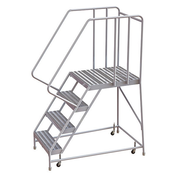 Rolling Ladder, Material Aluminum, Platform Height 3.3 ft, Handrails Included Yes, Handrail Height 2.7 ft, Overall Height 6 ft, Number of Steps 4, Assembled, Load Capacity 350 lb, Step Tread Ribbed, Platform Depth 28 in, Platform Width 24 in, Bottom Width 32 in, Base Depth 51 in, Overall Width 32 in, Climbing Angle 56 Degrees , Step Depth 7 in, Step Width 24 in, Ladder Actuation Spring-Loaded Casters, Finish Powder Coated, Color Gray, Standards ANSI, OSHA Compliant, Includes Crutch Tips