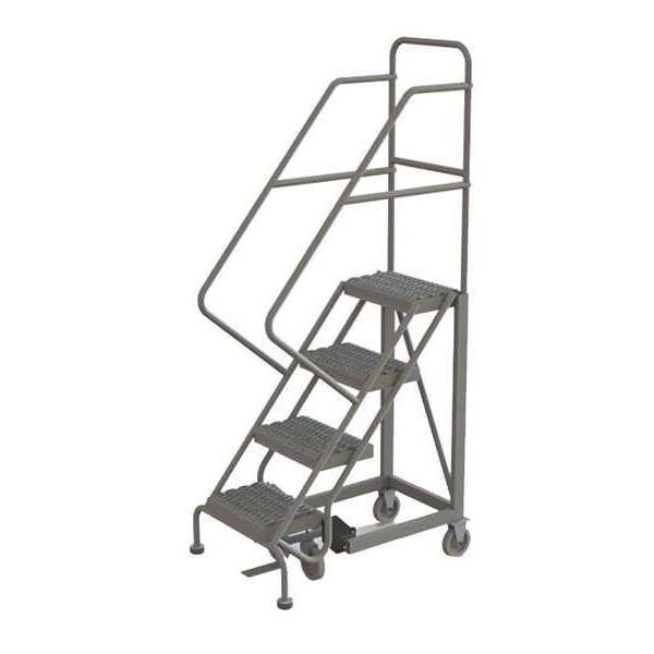 Rolling Ladder, Material Steel, Platform Height 3.3 ft, Handrails Included Yes, Handrail Height 3 ft, Overall Height 6 ft, Number of Steps 4, Unassembled, Load Capacity 450 lb, Step Tread Serrated, Platform Depth 17 in, Platform Width 16 in, Bottom Width 27 in, Base Depth 41 in, Overall Width 27 in, Climbing Angle 50 Degrees , Step Depth 8.5 in, Step Width 16 in, Ladder Actuation Foot Activated Step Lock, Finish Powder Coated, Color Gray, Standards ANSI, OSHA Compliant