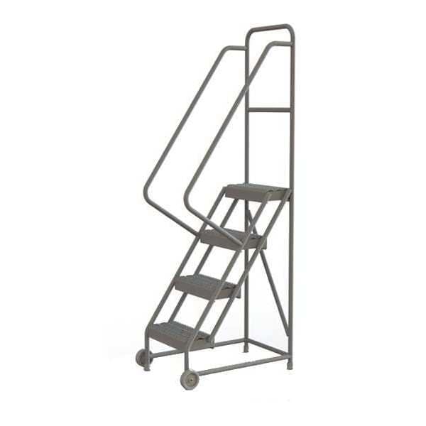 Tilt and Roll Ladder, Material Steel, Platform Height 3.3 ft, Handrails Included Yes, Handrail Height 3 ft, Overall Height 6.8 ft, Number of Steps 4, Unassembled, Load Capacity 450 lb, Step Tread Serrated, Platform Depth 10 in, Platform Width 16 in, Bottom Width 24 in, Base Depth 37 in, Overall Width 24 in, Climbing Angle 56 Degrees , Step Depth 7 in, Step Width 16 in, Ladder Actuation None, Finish Powder Coated, Color Gray, Standards ANSI, OSHA Compliant, Includes Crutch Tips