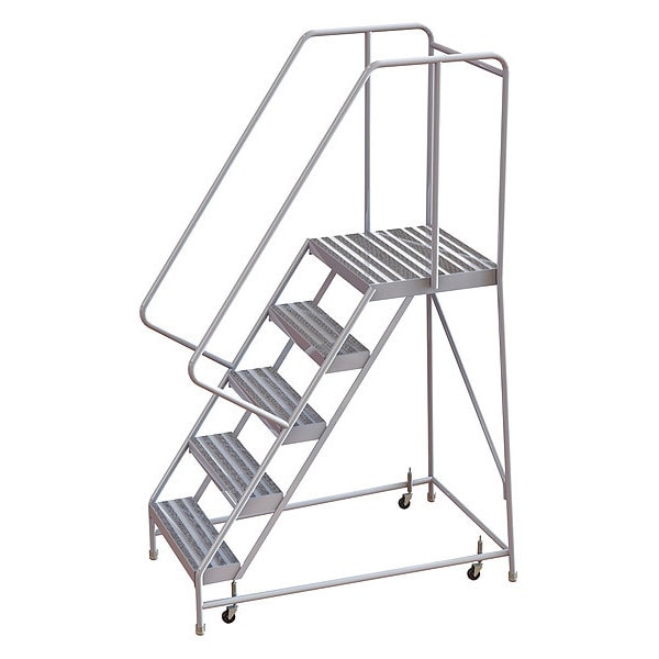Rolling Ladder, Material Aluminum, Platform Height 4.2 ft, Handrails Included Yes, Handrail Height 2.7 ft, Overall Height 6.8 ft, Number of Steps 5, Assembled, Load Capacity 350 lb, Step Tread Ribbed, Platform Depth 21 in, Platform Width 16 in, Bottom Width 22 in, Base Depth 51 in, Overall Width 22 in, Climbing Angle 56 Degrees , Step Depth 7 in, Step Width 16 in, Ladder Actuation Spring-Loaded Casters, Finish Powder Coated, Color Gray, Standards ANSI, OSHA Compliant, Includes Crutch Tips