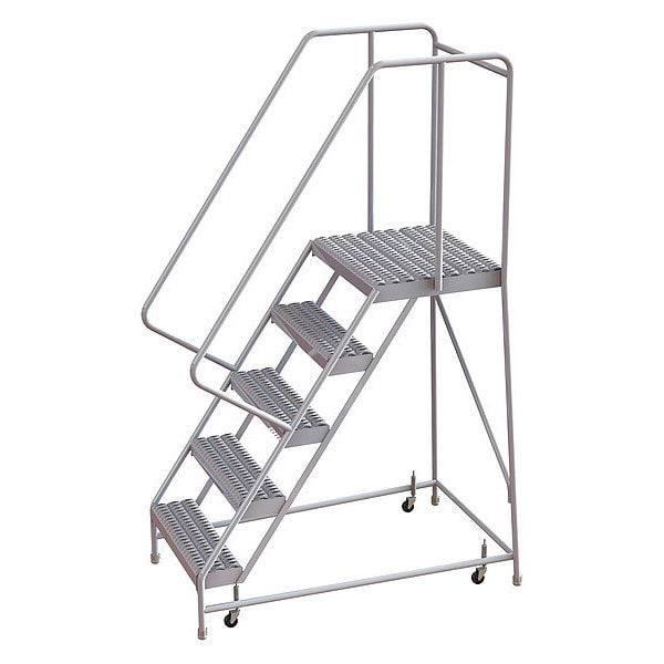 Rolling Ladder, Material Aluminum, Platform Height 4.2 ft, Handrails Included Yes, Handrail Height 2.7 ft, Overall Height 6.8 ft, Number of Steps 5, Assembled, Load Capacity 350 lb, Step Tread Serrated, Platform Depth 21 in, Platform Width 24 in, Bottom Width 32 in, Base Depth 51 in, Overall Width 32 in, Climbing Angle 56 Degrees , Step Depth 7 in, Step Width 24 in, Ladder Actuation Spring-Loaded Casters, Finish Powder Coated, Color Gray, Standards ANSI, OSHA Compliant, Includes Crutch Tips