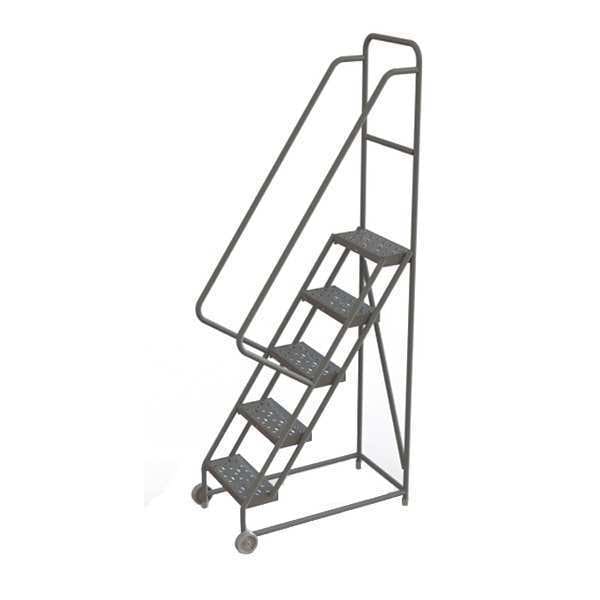 Tilt and Roll Ladder, Material Steel, Platform Height 4.2 ft, Handrails Included Yes, Handrail Height 3 ft, Overall Height 7.7 ft, Number of Steps 5, Unassembled, Load Capacity 450 lb, Step Tread Perforated, Platform Depth 10 in, Platform Width 16 in, Bottom Width 24 in, Base Depth 44 in, Overall Width 24 in, Climbing Angle 56 Degrees , Step Depth 7 in, Step Width 16 in, Ladder Actuation None, Finish Powder Coated, Color Gray, Standards ANSI, OSHA Compliant, Includes Crutch Tips