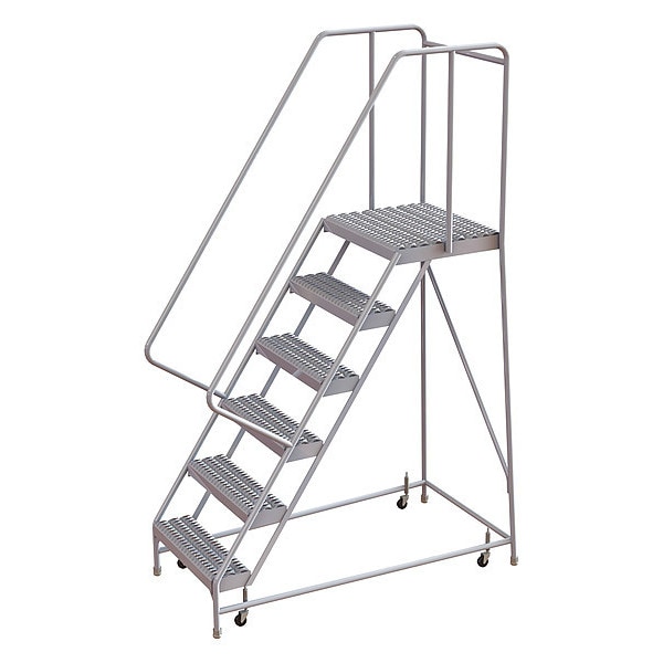 Rolling Ladder, Material Aluminum, Platform Height 5 ft, Handrails Included Yes, Handrail Height 2.7 ft, Overall Height 7.7 ft, Number of Steps 6, Assembled, Load Capacity 350 lb, Step Tread Serrated, Platform Depth 21 in, Platform Width 16 in, Bottom Width 26 in, Base Depth 58 in, Overall Width 26 in, Climbing Angle 56 Degrees , Step Depth 7 in, Step Width 16 in, Ladder Actuation Spring-Loaded Casters, Finish Powder Coated, Color Gray, Standards ANSI, OSHA Compliant, Includes Crutch Tips