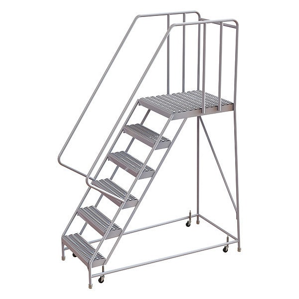 Rolling Ladder, Material Aluminum, Platform Height 5 ft, Handrails Included Yes, Handrail Height 2.7 ft, Overall Height 7.7 ft, Number of Steps 6, Assembled, Load Capacity 350 lb, Step Tread Serrated, Platform Depth 28 in, Platform Width 16 in, Bottom Width 26 in, Base Depth 65 in, Overall Width 26 in, Climbing Angle 56 Degrees , Step Depth 7 in, Step Width 16 in, Ladder Actuation Spring-Loaded Casters, Finish Powder Coated, Color Gray, Standards ANSI, OSHA Compliant, Includes Crutch Tips