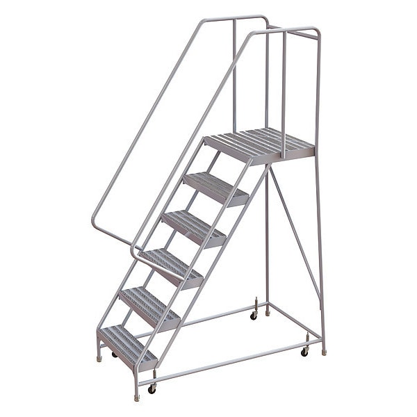 Rolling Ladder, Material Aluminum, Platform Height 5 ft, Handrails Included Yes, Handrail Height 2.7 ft, Overall Height 7.7 ft, Number of Steps 6, Assembled, Load Capacity 350 lb, Step Tread Ribbed, Platform Depth 21 in, Platform Width 24 in, Bottom Width 32 in, Base Depth 58 in, Overall Width 32 in, Climbing Angle 56 Degrees , Step Depth 7 in, Step Width 24 in, Ladder Actuation Spring-Loaded Casters, Finish Powder Coated, Color Gray, Standards ANSI, OSHA Compliant, Includes Crutch Tips