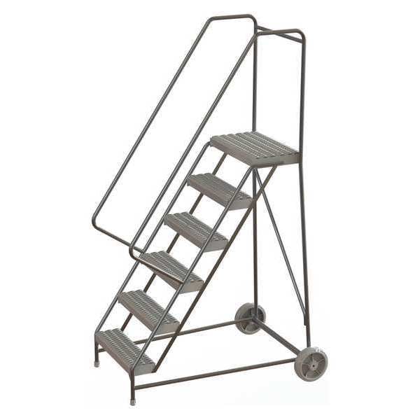 Wheelbarrow Ladder, Material Aluminum, Platform Height 5 ft, Handrails Included Yes, Handrail Height 2.7 ft, Overall Height 7.7 ft, Number of Steps 6, Assembled, Load Capacity 350 lb, Step Tread Serrated, Platform Depth 17 in, Platform Width 16 in, Bottom Width 31 in, Base Depth 55 1/2 in, Overall Width 31 in, Climbing Angle 56 Degrees , Step Depth 7 in, Step Width 16 in, Ladder Actuation None, Finish Unfinished, Color Gray, Standards ANSI, OSHA Compliant, Includes Crutch Tips