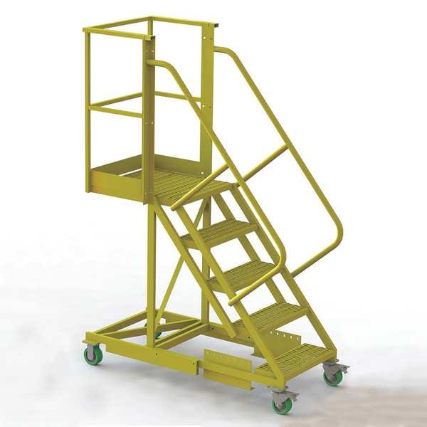 Material Steel, Platform Height 4.2 ft, Handrails Included Yes, Handrail Height 3.5 ft, Overall Height 7.7 ft, Number of Steps 5, Unassembled, Load Capacity 300 lb, Step Tread Perforated, Platform Depth 20 in, Platform Width 24 in, Bottom Width 41 in, Base Depth 64 in, Climbing Angle 50 Degrees , Step Depth 8.5 in, Step Width 24 in, Ladder Actuation Locking Casters, Finish Powder Coated, Color Yellow, Standards ANSI, OSHA Compliant, Manufacturers Warranty Length 1 yr