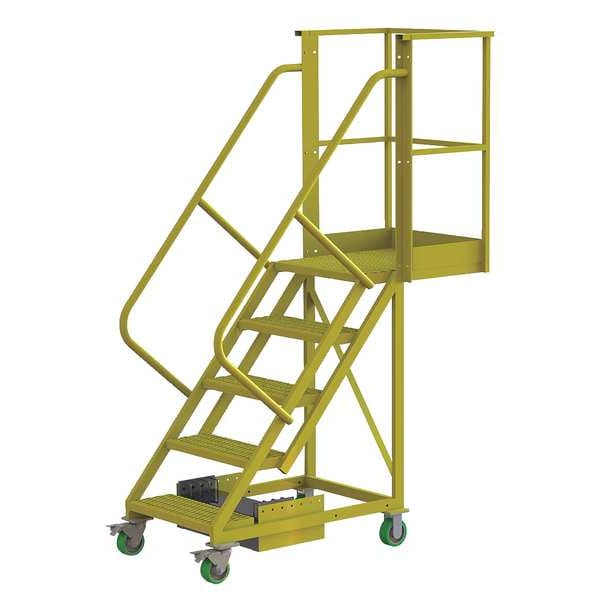 Material Steel, Platform Height 4.2 ft, Handrails Included Yes, Handrail Height 3.5 ft, Overall Height 7.7 ft, Number of Steps 5, Unassembled, Load Capacity 300 lb, Step Tread Perforated, Platform Depth 20 in, Platform Width 24 in, Bottom Width 30 in, Base Depth 64 in, Climbing Angle 50 Degrees , Step Depth 8.5 in, Step Width 24 in, Ladder Actuation Locking Casters, Finish Powder Coated, Color Yellow, Standards ANSI, OSHA Compliant, Manufacturers Warranty Length 1 yr