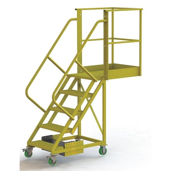 Material Steel, Platform Height 4.2 ft, Handrails Included Yes, Handrail Height 3.5 ft, Overall Height 7.7 ft, Number of Steps 5, Unassembled, Load Capacity 300 lb, Step Tread Serrated, Platform Depth 30 in, Platform Width 24 in, Bottom Width 30 in, Base Depth 74 in, Climbing Angle 50 Degrees , Step Depth 10 in, Step Width 24 in, Ladder Actuation Locking Casters, Finish Powder Coated, Color Yellow, Standards ANSI, OSHA Compliant, Manufacturers Warranty Length 1 yr