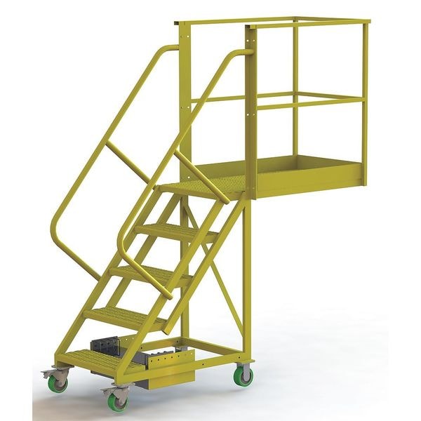 Material Steel, Platform Height 4.2 ft, Handrails Included Yes, Handrail Height 3.5 ft, Overall Height 7.7 ft, Number of Steps 5, Unassembled, Load Capacity 300 lb, Step Tread Serrated, Platform Depth 40 in, Platform Width 24 in, Bottom Width 30 in, Base Depth 84 in, Climbing Angle 50 Degrees , Step Depth 10 in, Step Width 24 in, Ladder Actuation Locking Casters, Finish Powder Coated, Color Yellow, Standards ANSI, OSHA Compliant, Manufacturers Warranty Length 1 yr