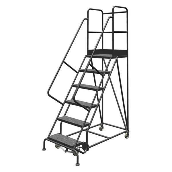Rolling Ladder, Material Steel, Platform Height 5 ft, Handrails Included Yes, Handrail Height 3 ft, Overall Height 8.5 ft, Number of Steps 6, Unassembled, Load Capacity 450 lb, Step Tread Perforated, Platform Depth 30 in, Platform Width 24 in, Bottom Width 35 in, Base Depth 70 in, Overall Width 35 in, Climbing Angle 56 Degrees , Step Depth 7 in, Step Width 24 in, Ladder Actuation Foot Activated Step Lock, Finish Powder Coated, Color Gray, Standards ANSI, OSHA Compliant