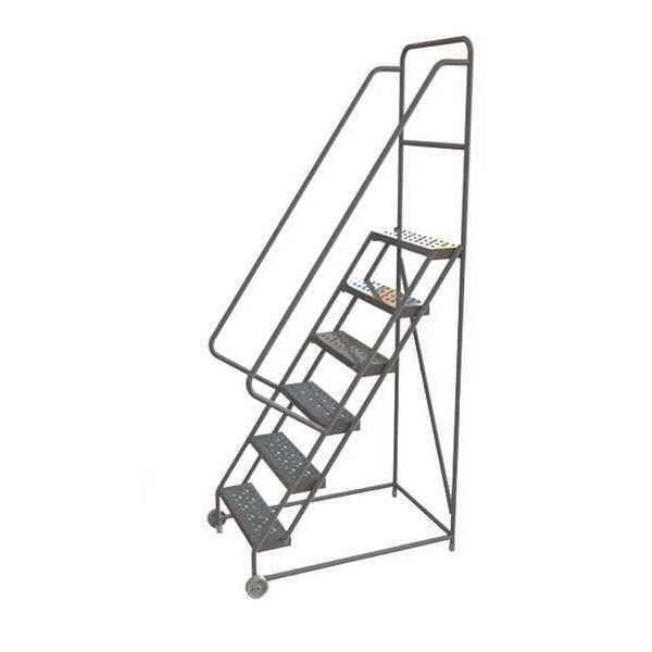 Tilt and Roll Ladder, Material Steel, Platform Height 5 ft, Handrails Included Yes, Handrail Height 3 ft, Overall Height 8.5 ft, Number of Steps 6, Unassembled, Load Capacity 450 lb, Step Tread Perforated, Platform Depth 10 in, Platform Width 24 in, Bottom Width 35 in, Base Depth 52 in, Overall Width 35 in, Climbing Angle 56 Degrees , Step Depth 7 in, Step Width 24 in, Ladder Actuation None, Finish Powder Coated, Color Gray, Standards ANSI, OSHA Compliant, Includes Crutch Tips