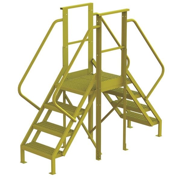 Crossover Bridge, Vertical Clearance 38 in, Span 20 in, Platform Height 3.3 ft, Platform Depth 20 in, Number of Steps 4, Bottom Width 30 in, Load Capacity 1,000 lb, Overall Span 20 in, Overall Height 6.8 ft, Handrail Height 3.5 ft, Climbing Angle 50 Degrees , Step Tread Serrated, Step Width 24 in, Step Depth 10 in, Material Steel, Finish Powder Coated, Color Yellow, Standards OSHA Compliant