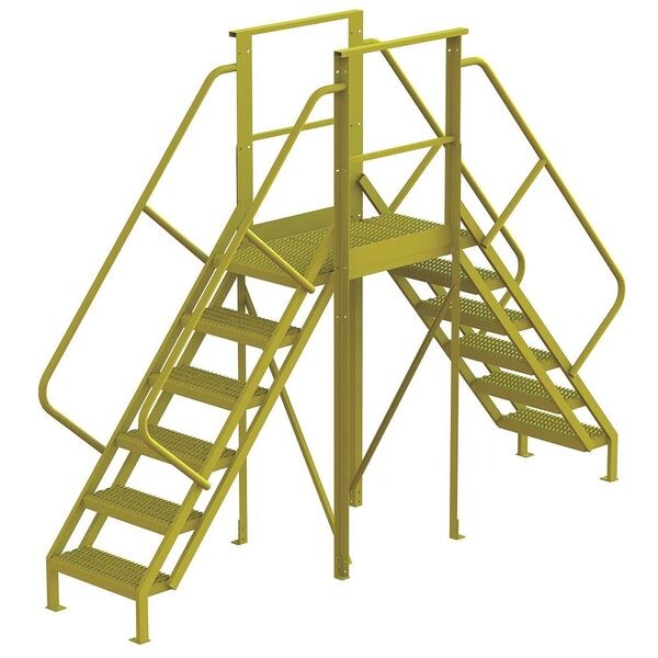 Crossover Bridge, Vertical Clearance 58 in, Span 30 in, Platform Height 5 ft, Platform Depth 30 in, Number of Steps 6, Bottom Width 30 in, Load Capacity 1,000 lb, Overall Span 30 in, Overall Height 8.5 ft, Handrail Height 3.5 ft, Climbing Angle 50 Degrees , Step Tread Perforated, Step Width 24 in, Step Depth 10 in, Material Steel, Finish Powder Coated, Color Yellow, Standards OSHA Compliant