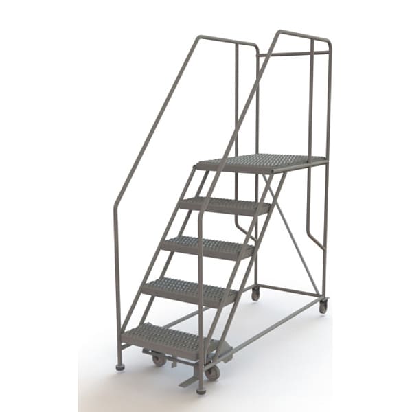 Single Access Rolling Platform, Material Steel, Platform Style Single Access, Platform Height 50 in, Load Capacity 800 lb, Number of Modular Decks 1, Base Depth 71 in, Bottom Width 35 in, Platform Depth 35 in, Platform Width 24 in, Overall Height 7 ft 2 in, Handrail Height 3 ft, Number of Guard Rails 3, Number of Legs 4, Number of Steps 5, Step Width 24 in, Step Depth 10 in, Climbing Angle 50 Degrees , Step Tread Serrated, Color Gray, Finish Powder Coated, Standards ANSI, OSHA Compliant