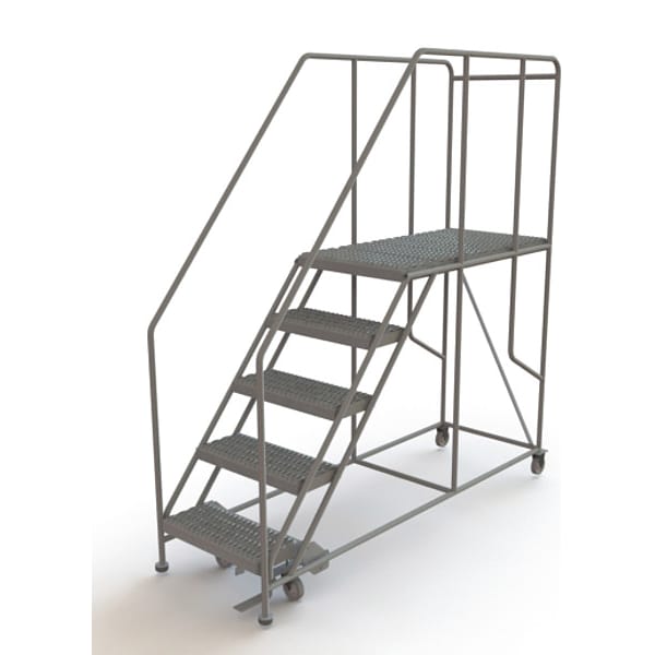 Single Access Rolling Platform, Material Steel, Platform Style Single Access, Platform Height 50 in, Load Capacity 800 lb, Number of Modular Decks 1, Base Depth 83 in, Bottom Width 35 in, Platform Depth 47 in, Platform Width 24 in, Overall Height 7 ft 2 in, Handrail Height 3 ft, Number of Guard Rails 3, Number of Legs Not Applicable, Number of Steps 5, Step Width 24 in, Step Depth 10 in, Climbing Angle 50 Degrees , Step Tread Serrated, Color Gray, Finish Powder Coated