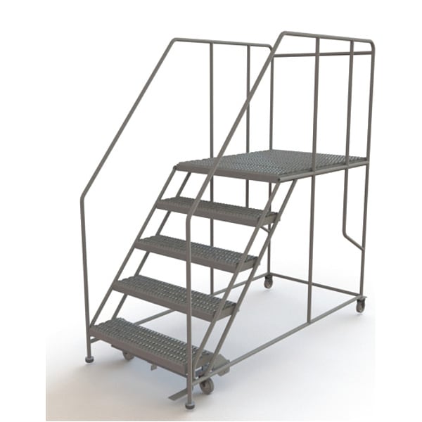 Single Access Rolling Platform, Material Steel, Platform Style Single Access, Platform Height 50 in, Load Capacity 800 lb, Number of Modular Decks 1, Base Depth 83 in, Bottom Width 40 in, Platform Depth 47 in, Platform Width 36 in, Overall Height 7 ft 2 in, Handrail Height 3 ft, Number of Guard Rails 3, Number of Legs 4, Number of Steps 5, Step Width 36 in, Step Depth 10 in, Climbing Angle 50 Degrees , Step Tread Serrated, Color Gray, Finish Powder Coated, Standards ANSI, OSHA Compliant