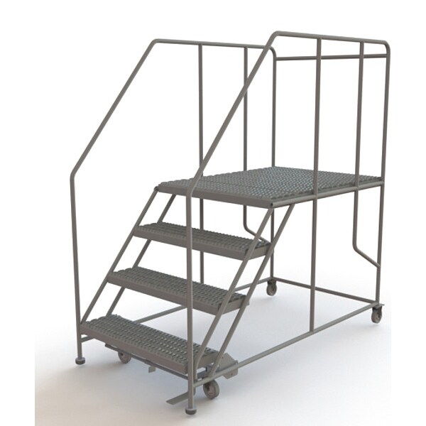 Single Access Rolling Platform, Material Steel, Platform Style Single Access, Platform Height 40 in, Load Capacity 800 lb, Number of Modular Decks 1, Base Depth 74 in, Bottom Width 40 in, Platform Depth 47 in, Platform Width 36 in, Overall Height 6 ft 4 in, Handrail Height 3 ft, Number of Guard Rails 3, Number of Legs 4, Number of Steps 4, Step Width 36 in, Step Depth 10 in, Climbing Angle 50 Degrees , Step Tread Serrated, Color Gray, Finish Powder Coated, Standards ANSI, OSHA Compliant
