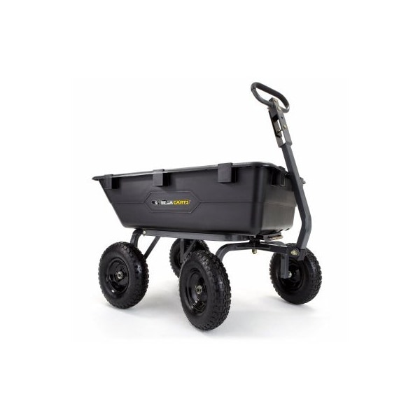 Gorilla 1200 LB Poly Garden Cart Quick Release Dumping System Balanced 4 Wheel Design Simple To Use 13 Pneumatic Tires Frame Design Allows For Easy Assembly While Improving Maneuverability & Rigidity Increasing Ground Clearance & Giving The Cart A Tight Turning Radius Maintenance Free & Easy To Clean Convertible 2 In 1 Handle Makes It Simple To Switch Between Pulling The Cart By Hand Or Towing Behind A Lawn Tractor Bed Dimensions 40 x 25 Cart Has An Overall Height Of 26.2 Weighs 60 LB.