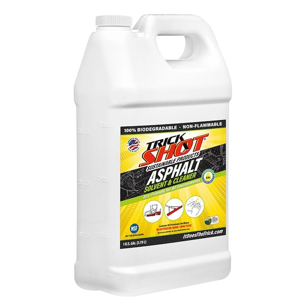 Bio-based Trick Shot Sustainable Products Asphalt SOLVENT AND CLEANER has been specifically developed as an EPA allowed alternative for the asphalt production, paving, and maintenance industries. Trick Shot is a high-performance product that dissolves bitumen, tar, oil, and tack from paving machinery, equipment, and tools. Trick Shot melts asphalt products with ease without harsh chemicals. It does not release harmful fumes, is non-flammable, safe for contact with skin, and is even registered NSF-H1 food safe making it extremely worker friendly.