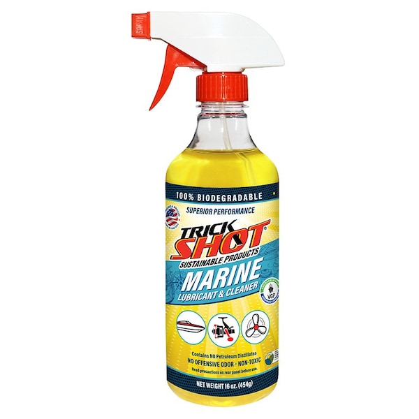 Use Trick Shot Marine Lubricant & Cleaner with confidence for all your tough applications to fight corrosion, clean & degrease, protect fiberglass, and lubricate. Trick Shot Marine Lubricant & Cleaner is 100% biodegradable and qualifies as a VGP environmentally acceptable lubricant, making it safe and hazard free for use around waterways.