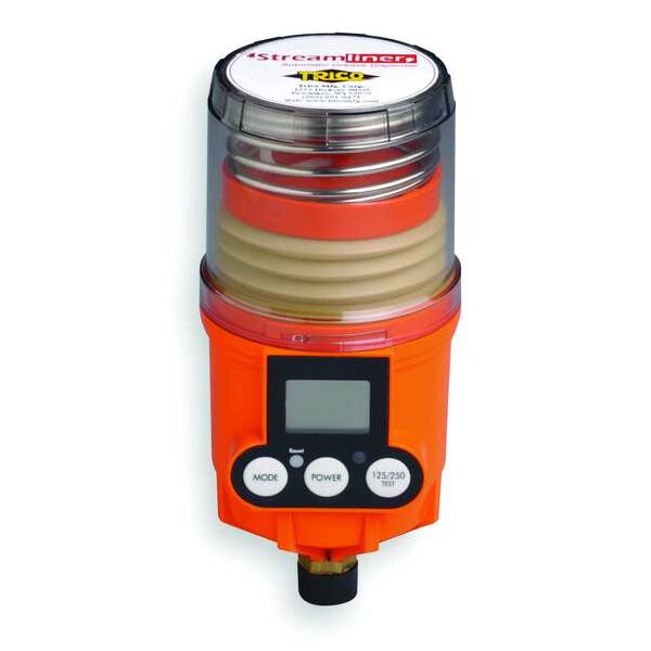 Streamliner(R) M Dispenser, Lubrication Point Type Multi, Feeder Capacity 250 cc, Operating Temperature - Minimum 5 Degrees F, Operating Temperature - Maximum 140 Degrees F, Spring Force 280 psi, Connection Size 3/8 in, Connection Type NPT, Feeder Material Polycarbonate, Flow Rate Adjustability Adjustable, Delivery Method Continuous, Includes Service Indicator, Refillable Yes, Overall Diameter 3 in, Overall Height 8 3/8 in