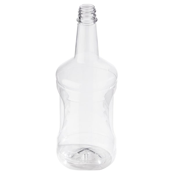 This 1.75 liter 59 oz clear PET plastic liquor bottle has a 33 mm neck finish. A long neck and a tapered body with a Ring Force Grip for better grip and hold. In clear polyethylene terephthalate PET resin, this bottle offers a good oxygen barrier, moisture barrier, and solvent fragrance barrier. In addition, it provides lightweight impact-resistant plastic to give you a beautiful alternative to glass bottles. The excellent clarity and surface gloss of PET resin expand the possibilities.