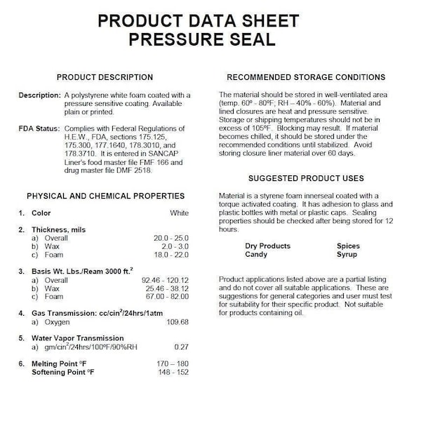 Pressure sensitive seals are a quick and easy way to safeguard your product from being tampered with while also preserving the freshness of your product by providing an airtight seal. These polystyrene foam liners, made from FDA approved materials, are coated with a torque-activated adhesive and require no special equipment to apply. Simply place them over the mouth of any bottle or jar, and screw on your closure tightly. These single-use seals are made to work with all container materials from glass to plastic, and easily peel off for consumer use.