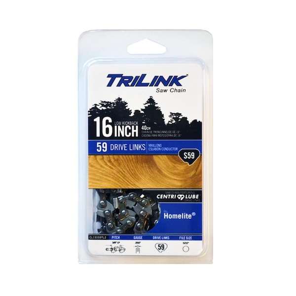 Specs: Description: Chain Loop 3/8 LP Semi-Chisel .050 59DL , Pitch: 3/8" LP , Gauge: .050" , Drive Links: 59 , File: 5/32" , This saw chain met the kickback performance requirement of ANSI B175.1-2012 when tested according to the provisions of ANSI B175.1-2012 low-kickback saw chain meets the kickback performance requirement of CSA Standard Z62.13 , Features the Centri-Lube oil distribution system to extend the life of your saw chain , Low-kickback semi-chisel saw chain for added safety , Out of package sharp and ready to cut; a sharp chain is a safe chain , Heat-treated and hard chromed cutters deliver a weather-resistant chain that cuts efficiently and extends chain life Replaces OEM Numbers: Oregon: S59 - 91 PX Chain Compatible With/Replacement For: HOMELITE - 180, 190, 192, 200, 200 electric, 245 (before XE339), Bandit, Classic 192, Little Red, LX30, Super 2, Super 2CC, VI Super 2, XEL-14, XEL, XL, XL2 (after # 5042001), XL-10, XL-14, XL-16, XL2CC