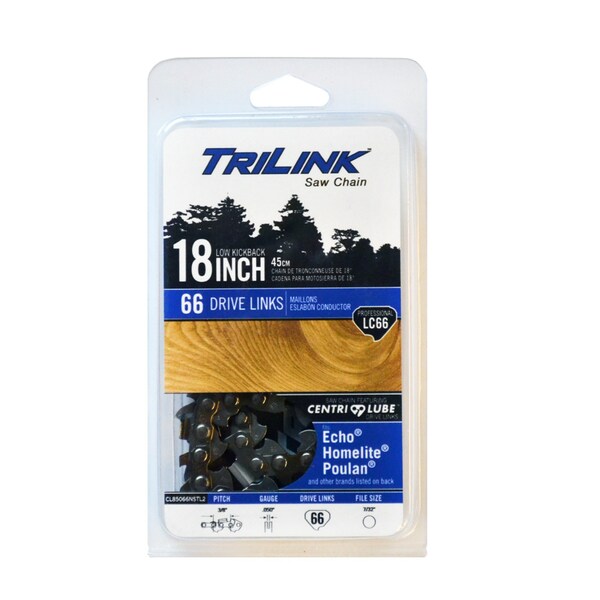 Specs: Description: Chain Loop 3/8 Std Chisel 050 66DL , Pitch: 3/8" std. , Gauge: .050" , Drive Links: 66 , File: 7/32" , This saw chain met the kickback performance requirement of ANSI B175.1-2012 when tested according to the provisions of ANSI B175.1-2012 low-kickback saw chain meets the kickback performance requirement of CSA Standard Z62.22 , Features the Centri-Lube oil distribution system to extend the life of your saw chain , Full chisel saw chain for a faster, more aggressive cut in clean cutting conditions , Out of package sharp and ready to cut; a sharp chain is a safe chain , Heat-treated and hard chromed cutters deliver a weather-resistant chain that cuts efficiently and extends chain life Replaces OEM Numbers: Oregon: D66 - 72V Chain Compatible With/Replacement For: CRAFTSMAN / SEARS - 35212, 35608, 35690, 35887, 35483, 35609, 35885, 35889 DAYTON - 2Z462, 2Z561, 4Z251, 4Z252, 4Z973, 7Z627, 2Z463, 2Z971, 4Z251A, 4Z397, 6Z826, 2Z462A ECHO - CS-620P, CS-620PQ, CS650, CS660, CS670, CS680, CS701, CS702, CS706, CS750, CS6700, CS501EVL, CS510EVL, CS8000, CST610, CS-900, CS-1001 HOMELITE - 330, 360, 410, 450, 460, 540, 550, 650, 750, 825, 850, 922, 923, 925, 35 SL Super, Super XL, Super XLAO, SXL 922, SXL 923, SXL 925, VI 955, XL (700, 800, 900, Series), XL 12, XL 15, XL400 JOHN DEERE - 65, 50AV, 50V, 51SV, 55SV, 55V, 60V, 66SV, 70V, 80EV MCCULLOCH - 10-10A, CP55, CP70, CP70L, Double Eagle: 50, 80, Eager Beaver: 3.4, 3.7, Mac: 1-10, 2-10, 3-10, 4-10, 5-10, 6-10, 7-10, 10-10, Pro: 10-10A, Pro Mac: 55, 555, 570, 5700, 60, 605, 610, 650, 655, 700, 800, 805, 850, Silver Eagle: 3420, 3720, Super Pro: 60, 70, 80, 81, Titan: 50, 57, Timber Bear OLEO-MAC - 250, 250A, 251, 252, 254, 260, 261, 264, 27, 280, 284, 355, 460, 461, 480, 481, 482 POULAN / POULAN PRO - 203, 245, 306, 360, 361, 375