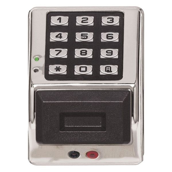 Keyless Access Control Keypad, Access Type Keypad and Proximity Card Reader, Finish Chrome-Plated, Number of Keys 0, Timed Entry Allowance 5 to 15 sec, Operating Temp. Range -31 Degrees to 151 Degrees F, Event Audit Trail 40,000, Max. User Codes 2000, Max. Proximity Range 1 in, Standards UL listed, Weather Resistant Yes, Features (2) 8a Relays, 500 Scheduled Events, Keypad or PC Programmable, Real Time Clock, Remote Release, Request-To-Exit Input, Tamper Supervised (Reportable to Alarm System)